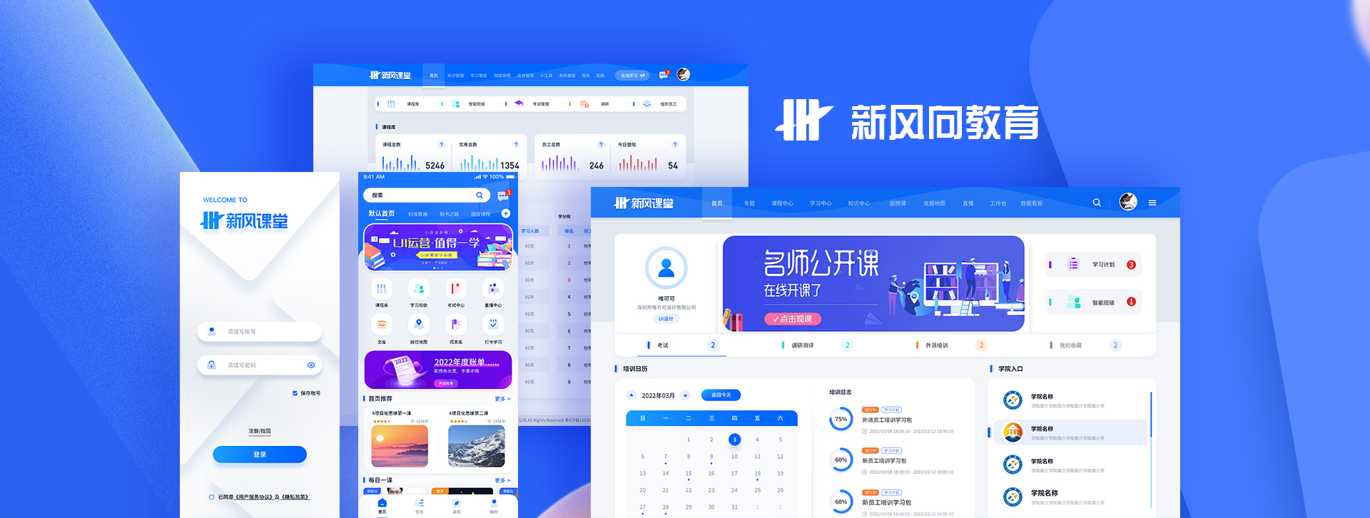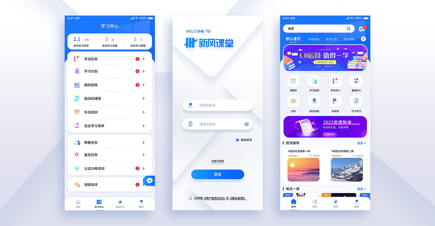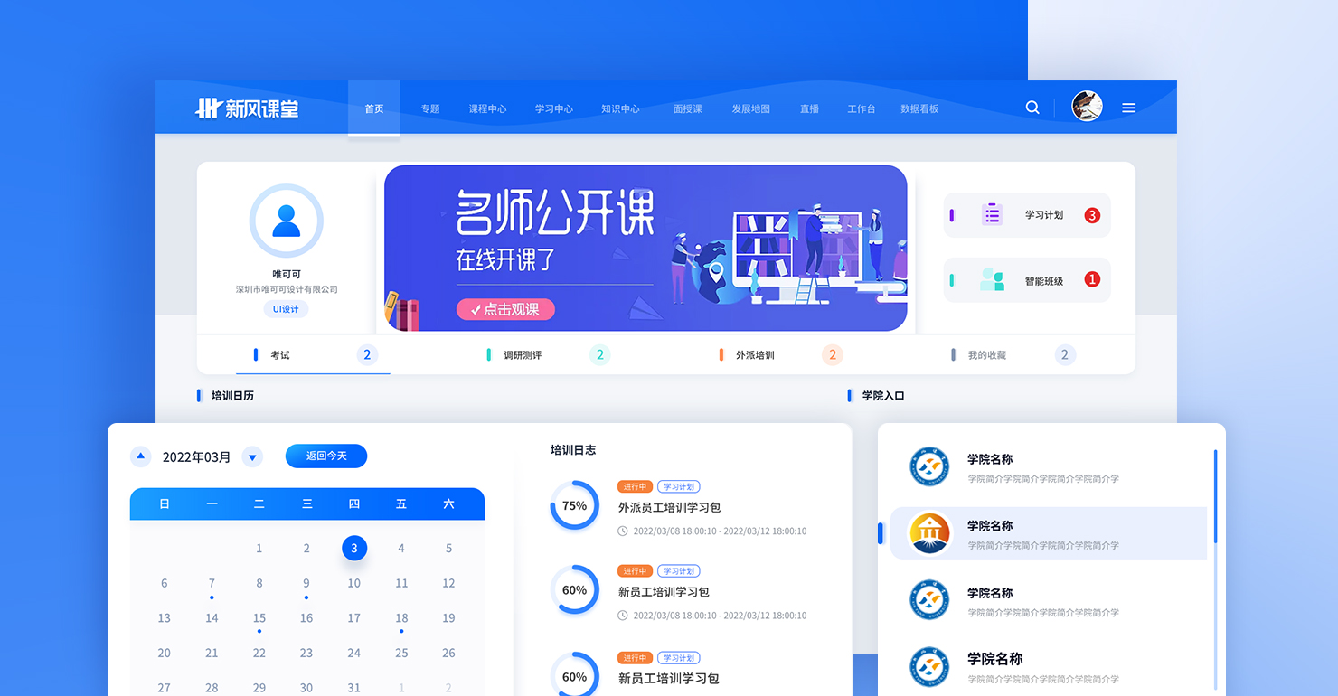 以冷靜、成熟的藍色為主色調,運用大量卡片式設計區分功能模塊,便于用戶操作使用平臺功能,主題以簡約、清新、輕質感為核心,采用大比例淺色系,迎合行業需求。多處運用白色卡紙形象,是為了知識擬物化,希望用戶可以通過該平臺將自己從一張白紙積累成繽紛彩畫。